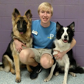 He is a sophomore at the University of North Georgia and is in their Pre-Vet program. When he needed work, his passion for dogs made Pawtropolis the obvious choice. His favorite part of the job is supervising playgroups, where he spends his time getting to know each dog personally and making sure that they are comfortable with him. His favorite dogs to see include Kaiser, a German Shepherd, and Max, a Border Collie. He is pictured here with Portia and Max!.
