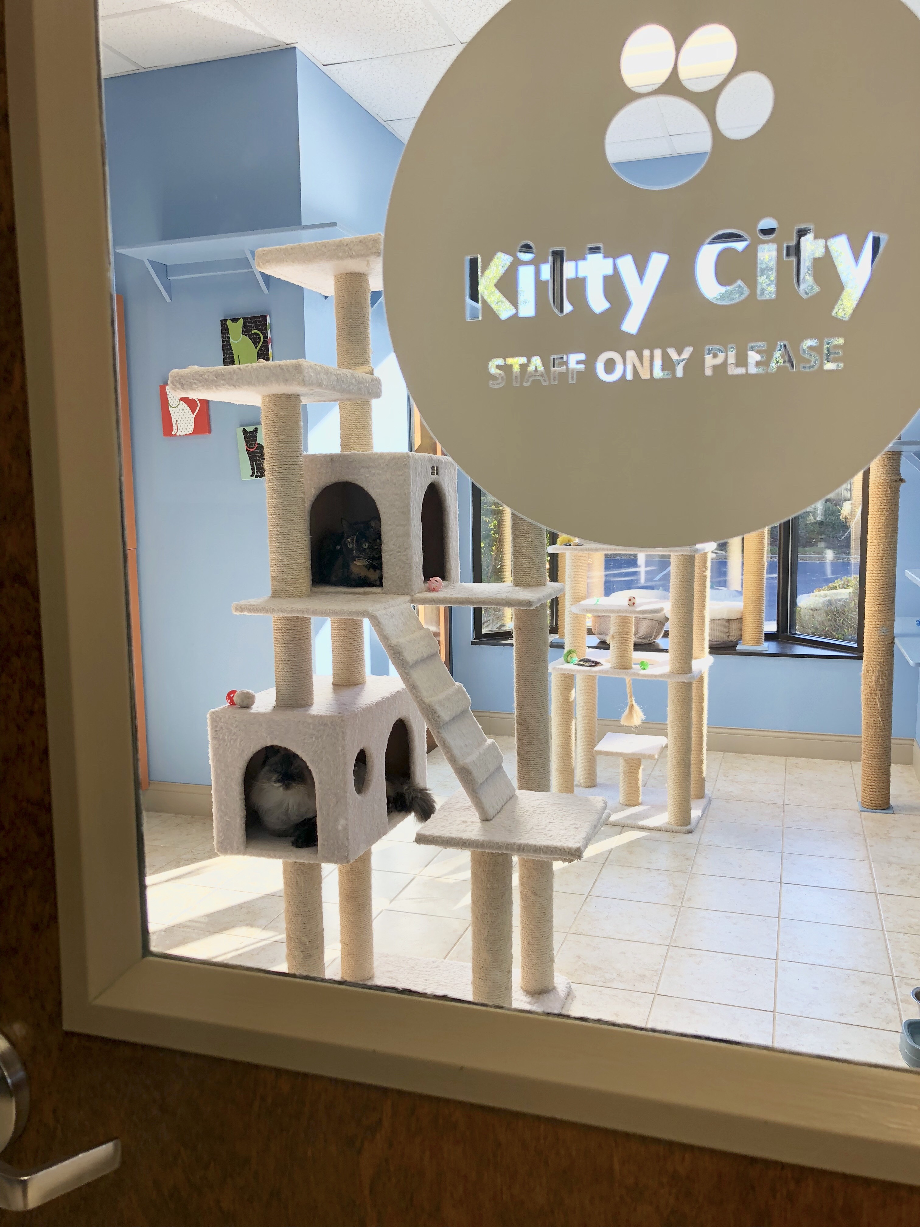 Our Kitty City is located far from the dogs. This allows the cats to enjoy a quiet environment (with a little music.) Kitty City boasts a huge bay window letting the cats have a piece of nature in the safety of our facility. We have several levels of climbing ledges and perches. Another way to keep the cats stimulated is by having large windows where they can view the Pet Boutique. At our Olympic Drive locat